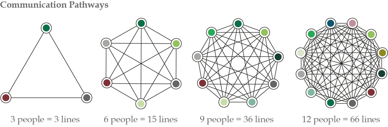 But as more members are added, this number grows exponentially. Between six team members, there are 15 relationships. At 12 members, this jumps to 66 links. By the time you have a team of 50 analysts, there are 1,225 different relationships within the team. It is impossible for a team above a certain – quite small – size to be internally cohesive.